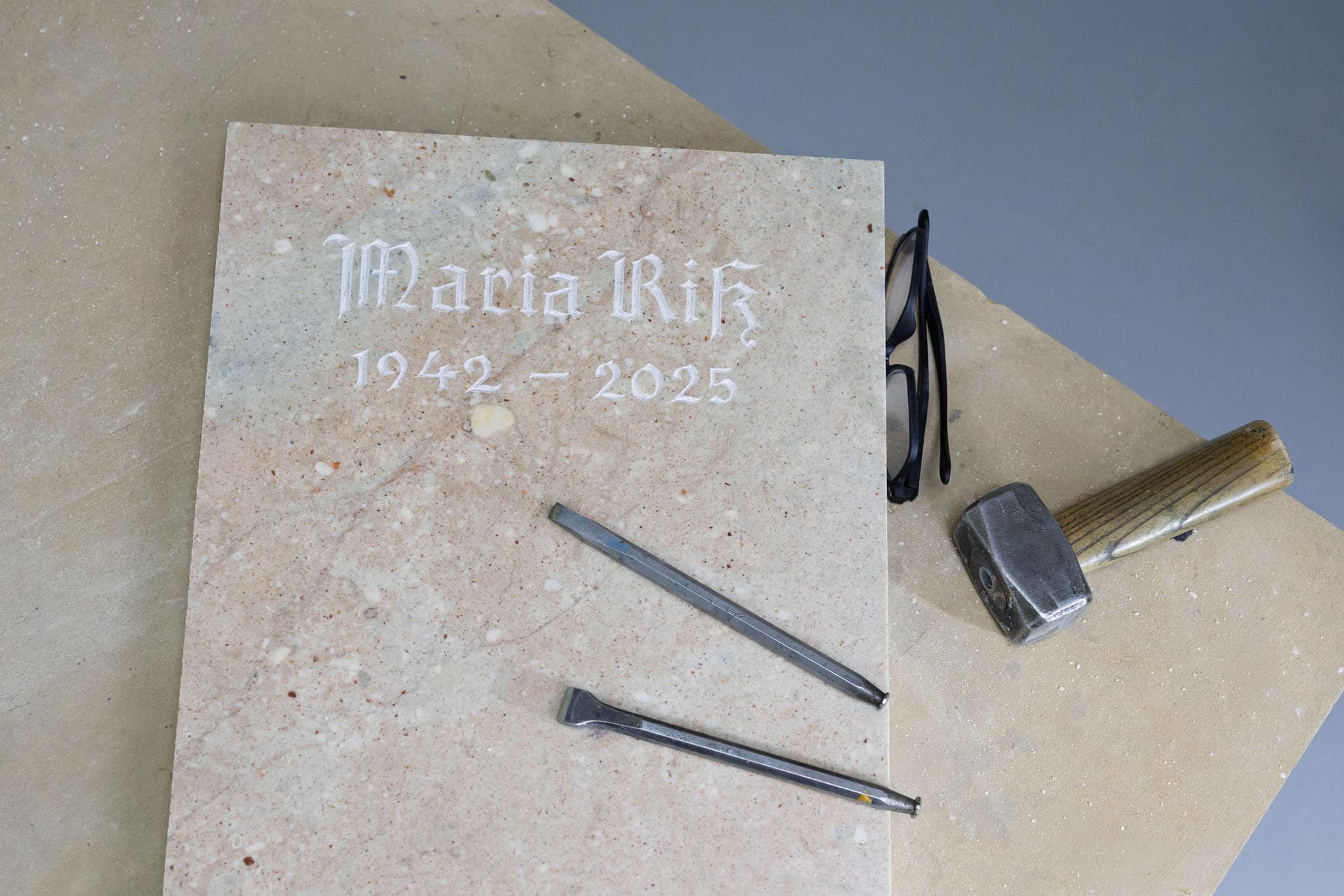 Unser Prozess macht die Erinnerung an Verstorbene sichtbar und schenkt den ausgewählten Formen und Worten eine dauerhafte Gestalt.